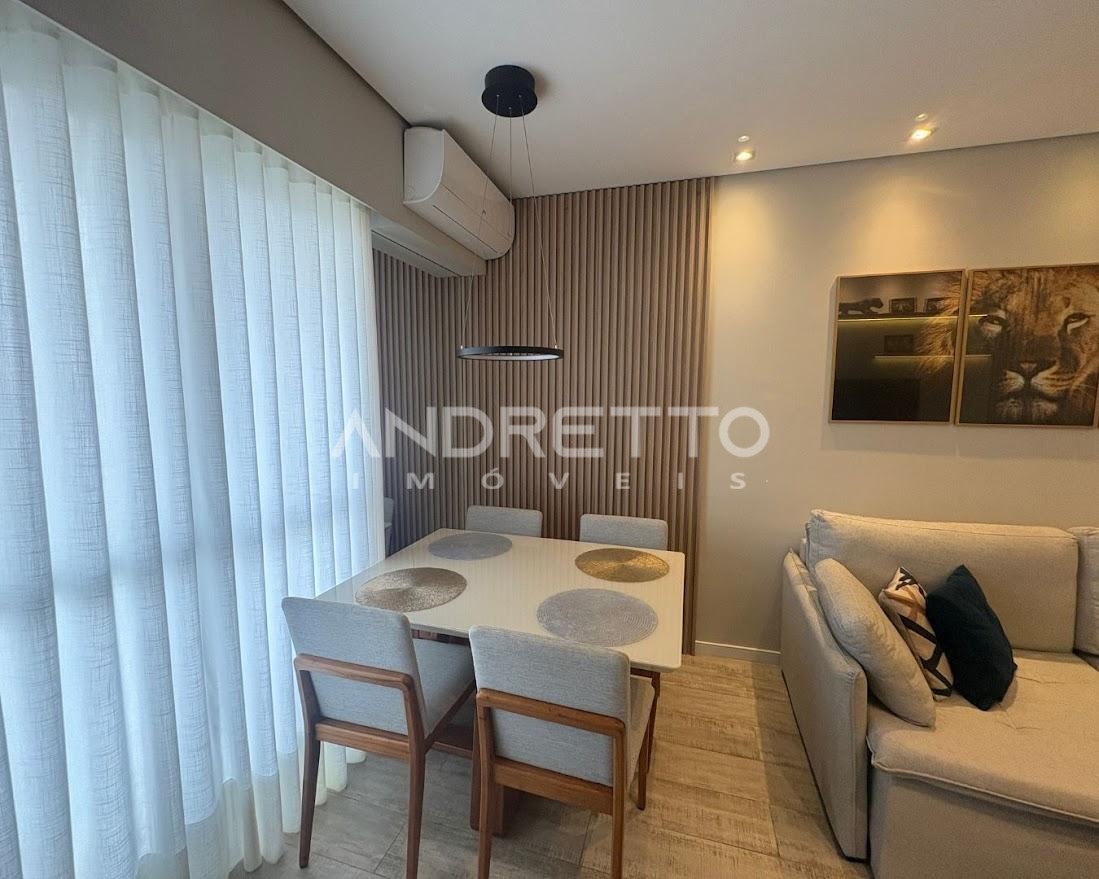 O banheiro possui box Blindex e gabinete. A sala oferece dois ambientes integrados, climatizada com ar-condicionado, e já equipada com mesa de jantar para 4 lugares, além de ótima iluminação natural.