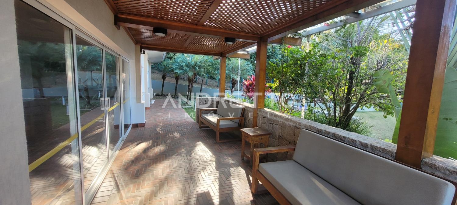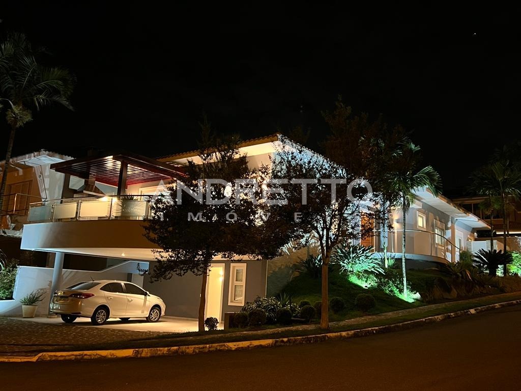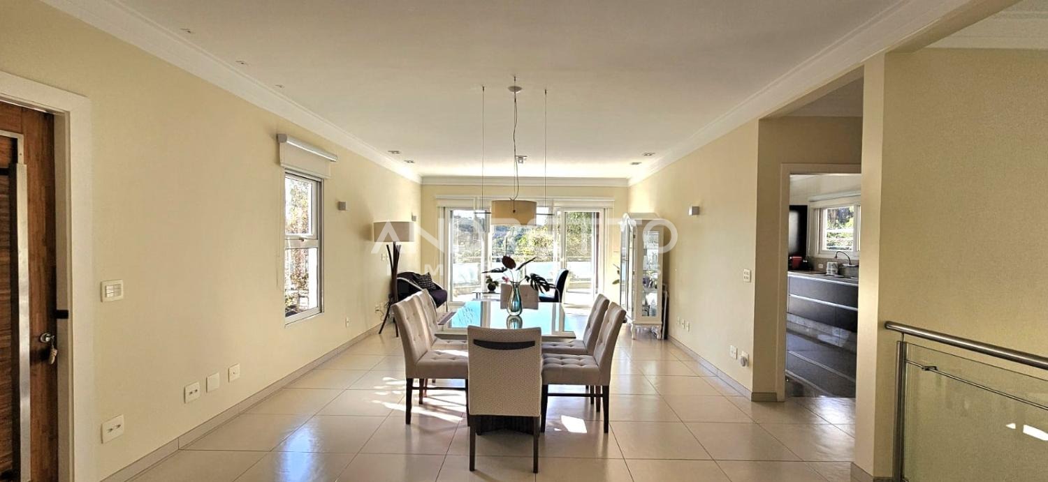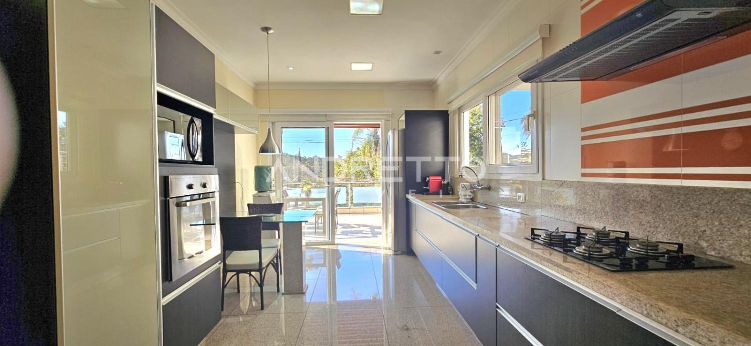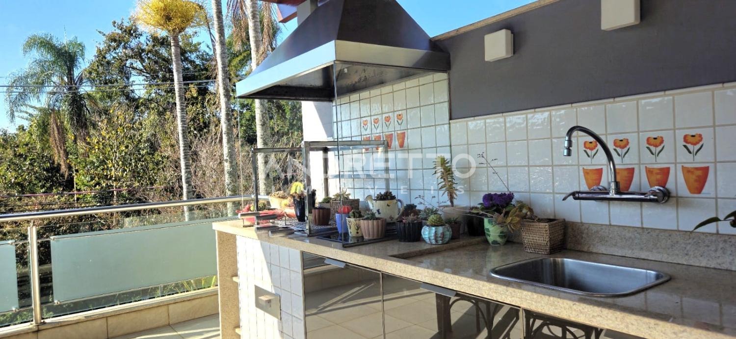 Ambientes integrados entre as salas, varanda, espaço gourmet e cozinha, rica em armários planejados, ar condicionado em todos os ambientes, espaço gourmet com churrasqueira e com vista para área de preservação, suíte máster com closet, pia com cuba dupla e banheira de hidromassagem para 5 pessoas, cozinha toda planejada com copa e despensa, ampla lavanderia, aquecimento solar para água, portas e janelas em PVC, janelas automatizadas e com tela mosqueteira, escada com guarda corpo em vidro e em aço inox, piso em porcelanato, alarme, garagem para 6 veículos sendo 3 cobertas.