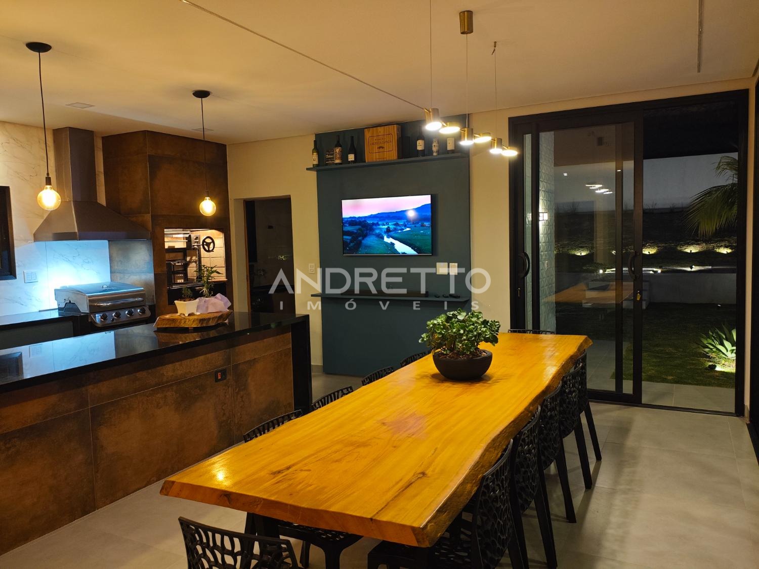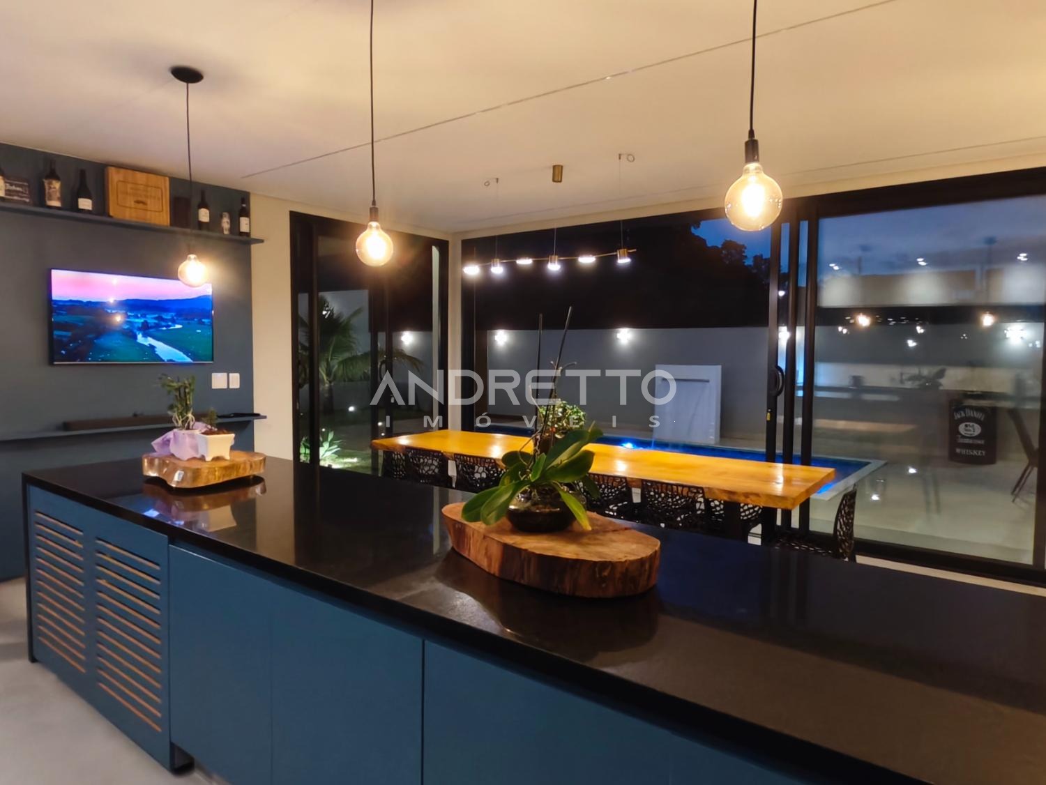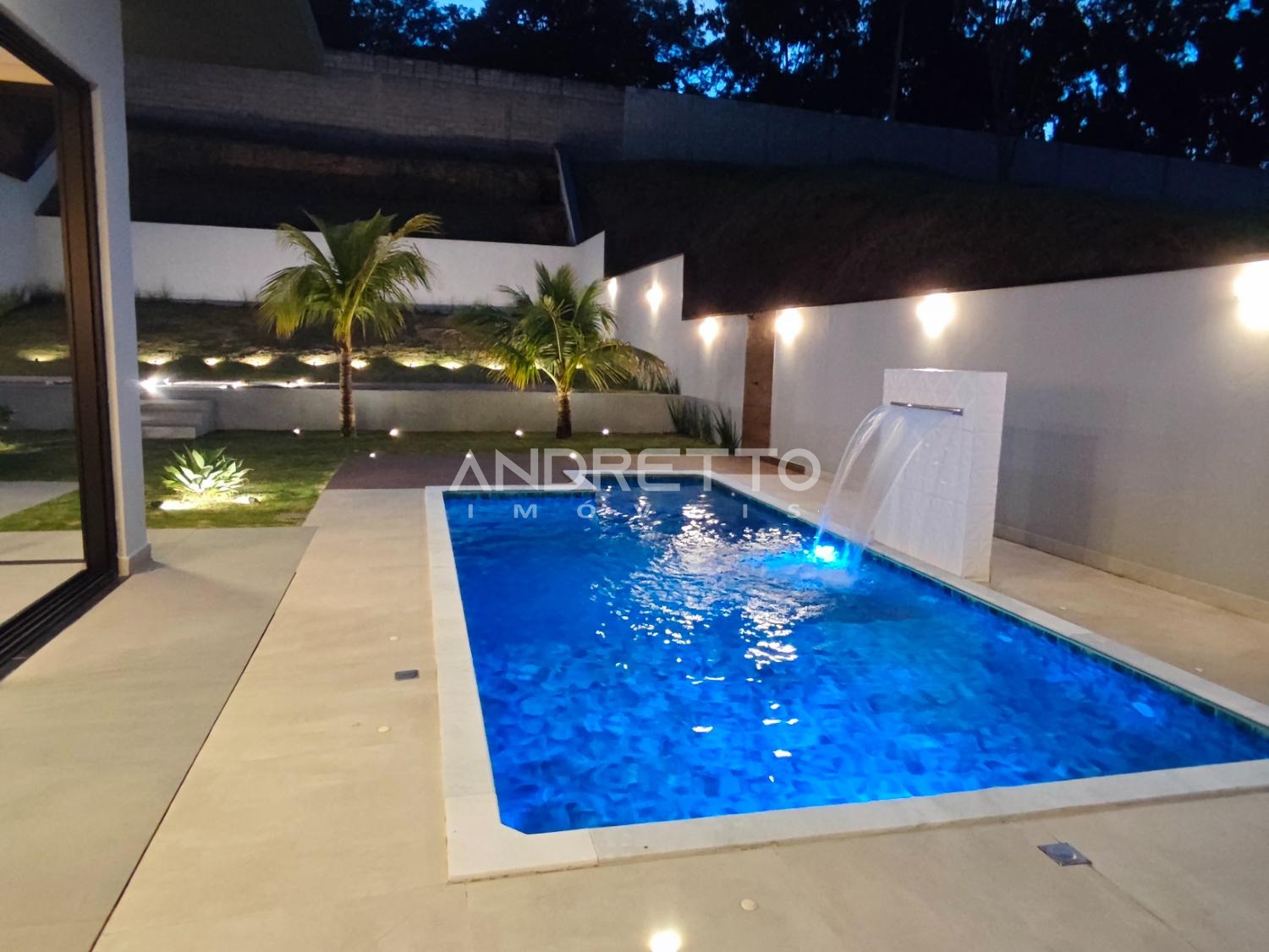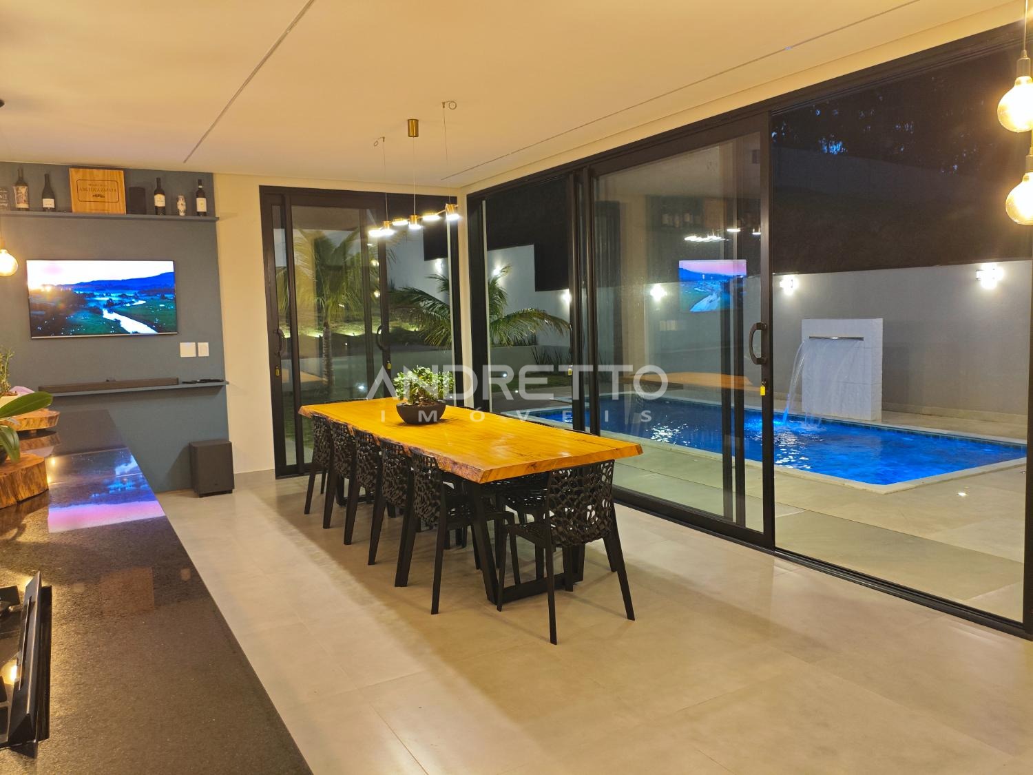 Na área social, a casa ganha vida com a cozinha gourmet integrada ao espaço de lazer, onde estão duas opções de churrasqueira: uma no estilo Parrilla argentina e outra a gás. A área externa é um dos pontos altos da residência, com uma piscina automatizada pela Alexa, equipada com cascata, hidromassagem, iluminação em LED e aquecimento solar, perfeita para momentos de lazer e descontração.