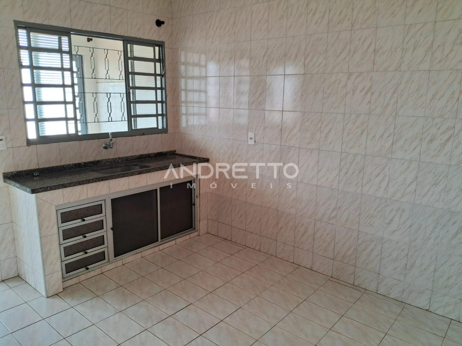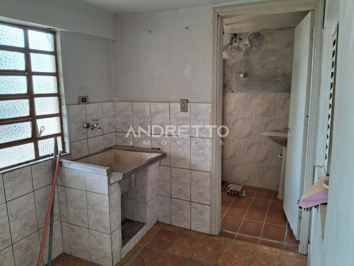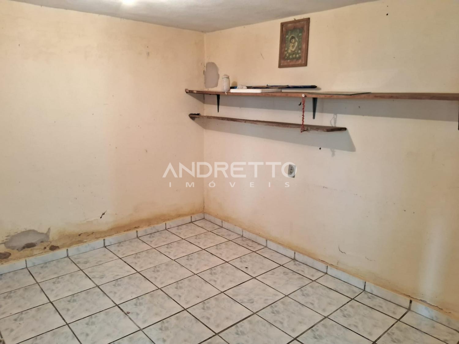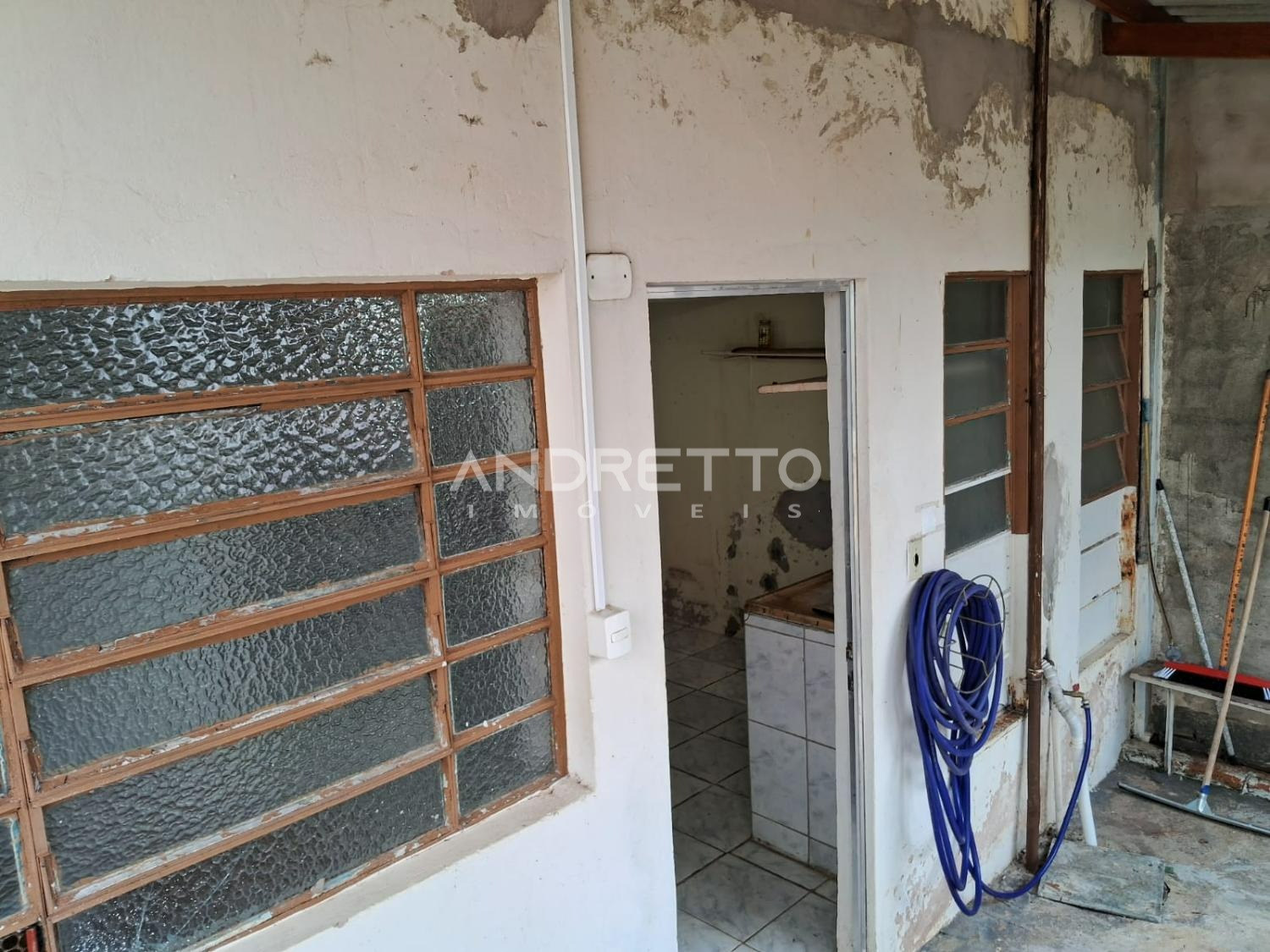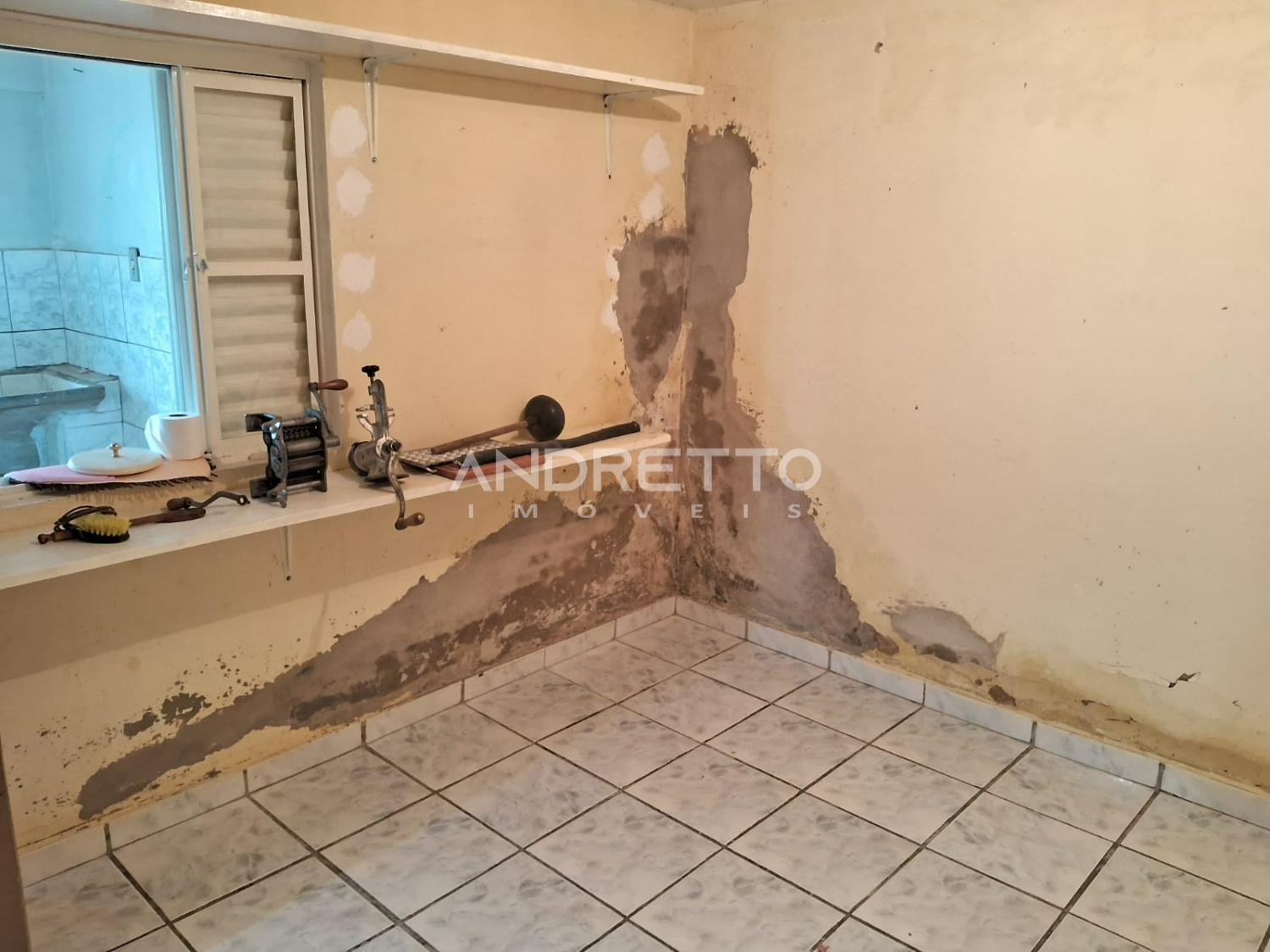 Casa com dois quartos, um banheiro social, cozinha com armários, sala de TV, área de serviço, amplo quintal com quartinho de despejo.