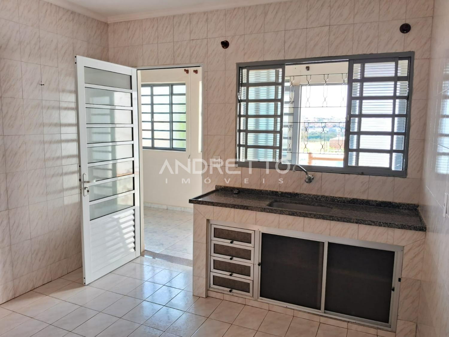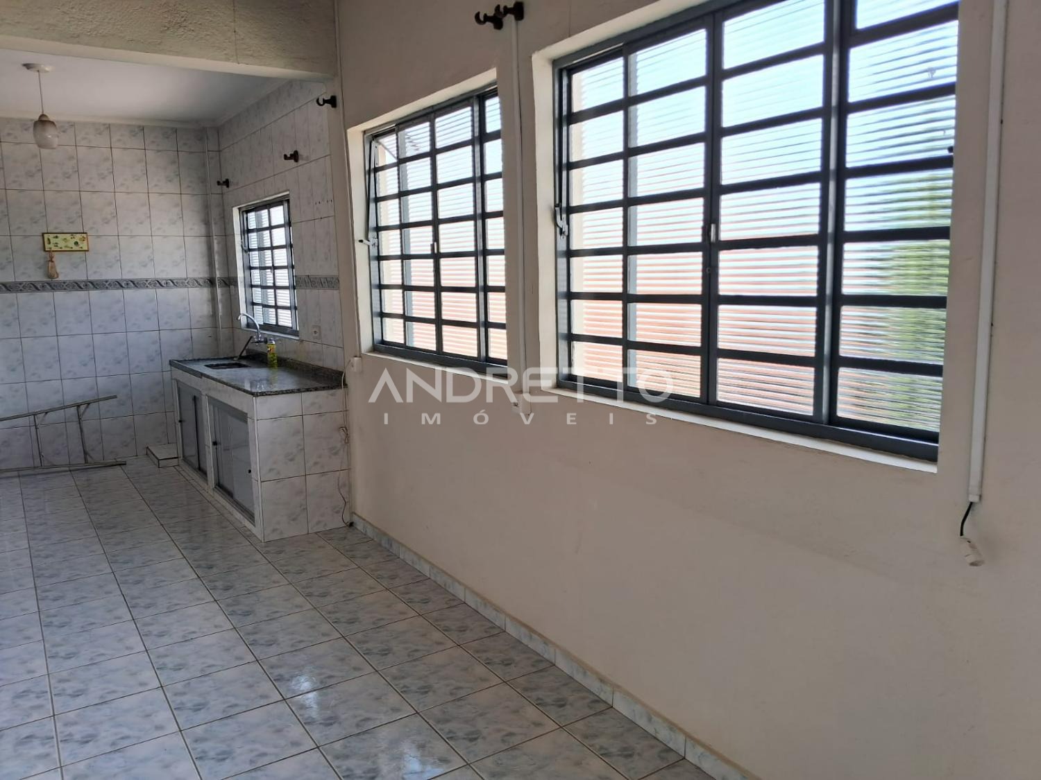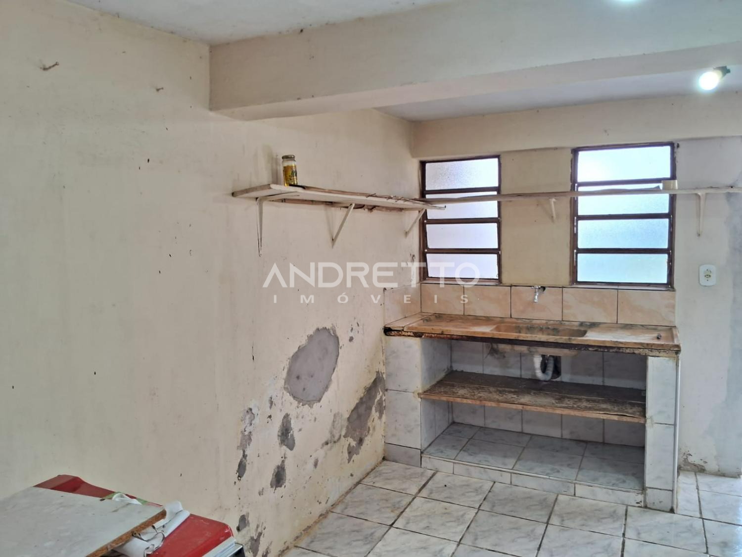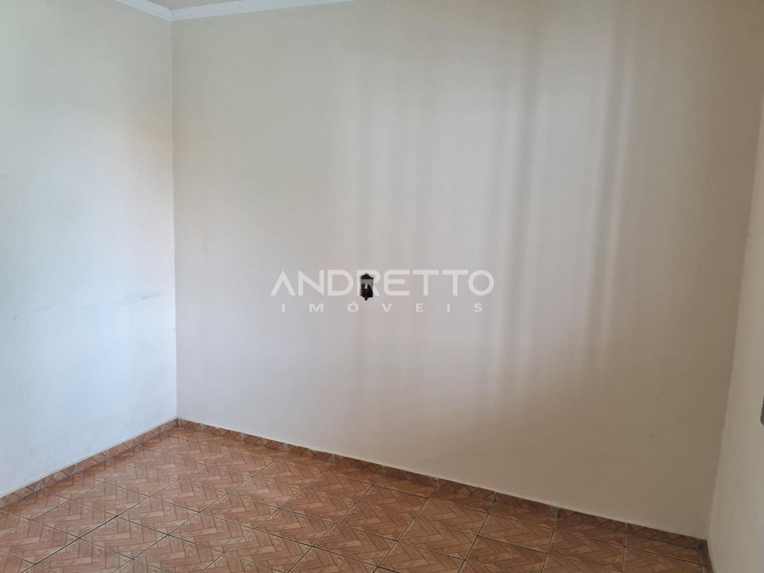 Casa com dois quartos, um banheiro social, cozinha com armários, sala de TV, área de serviço, amplo quintal com quartinho de despejo.