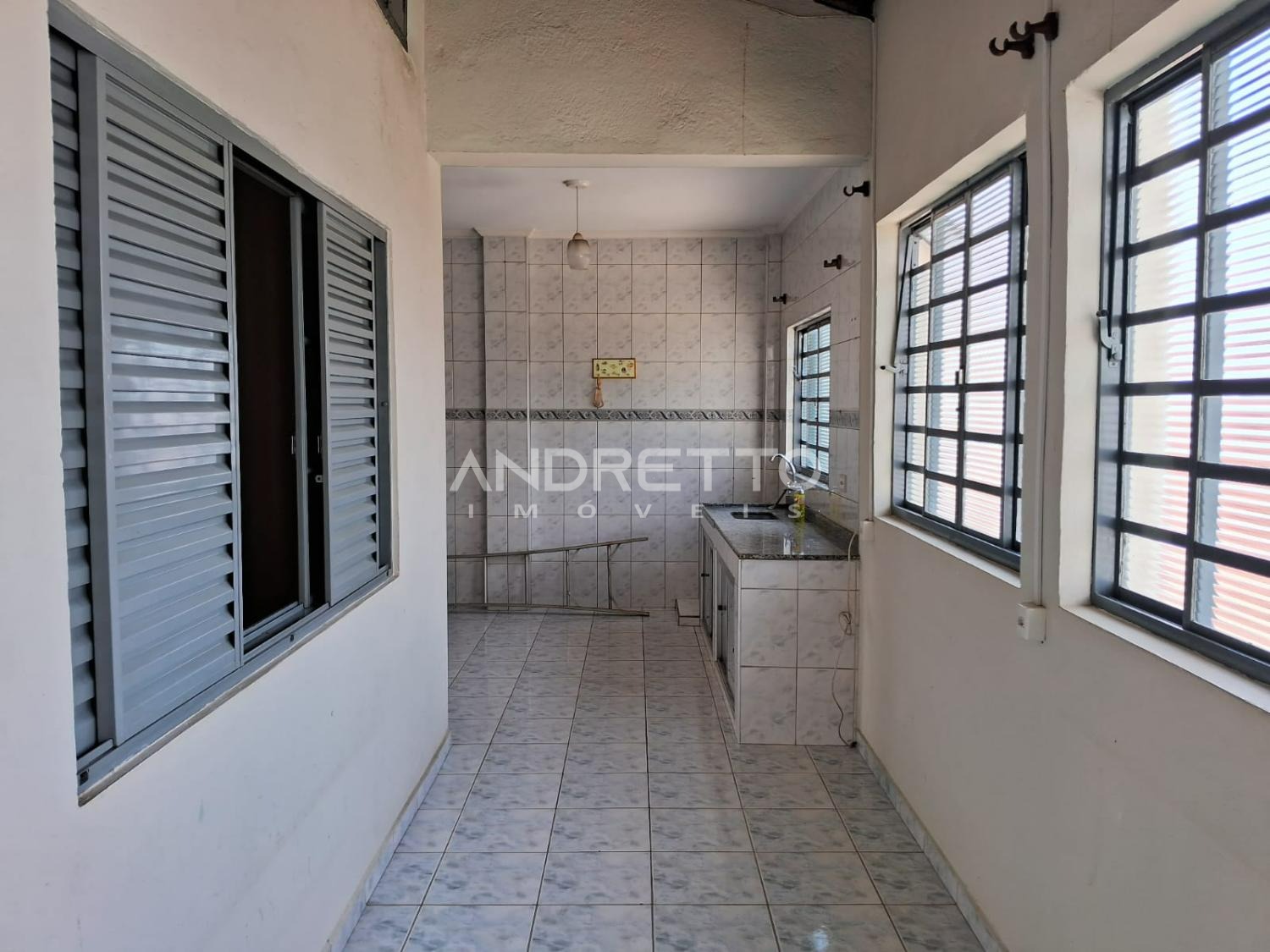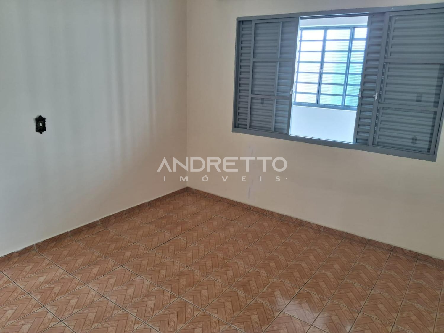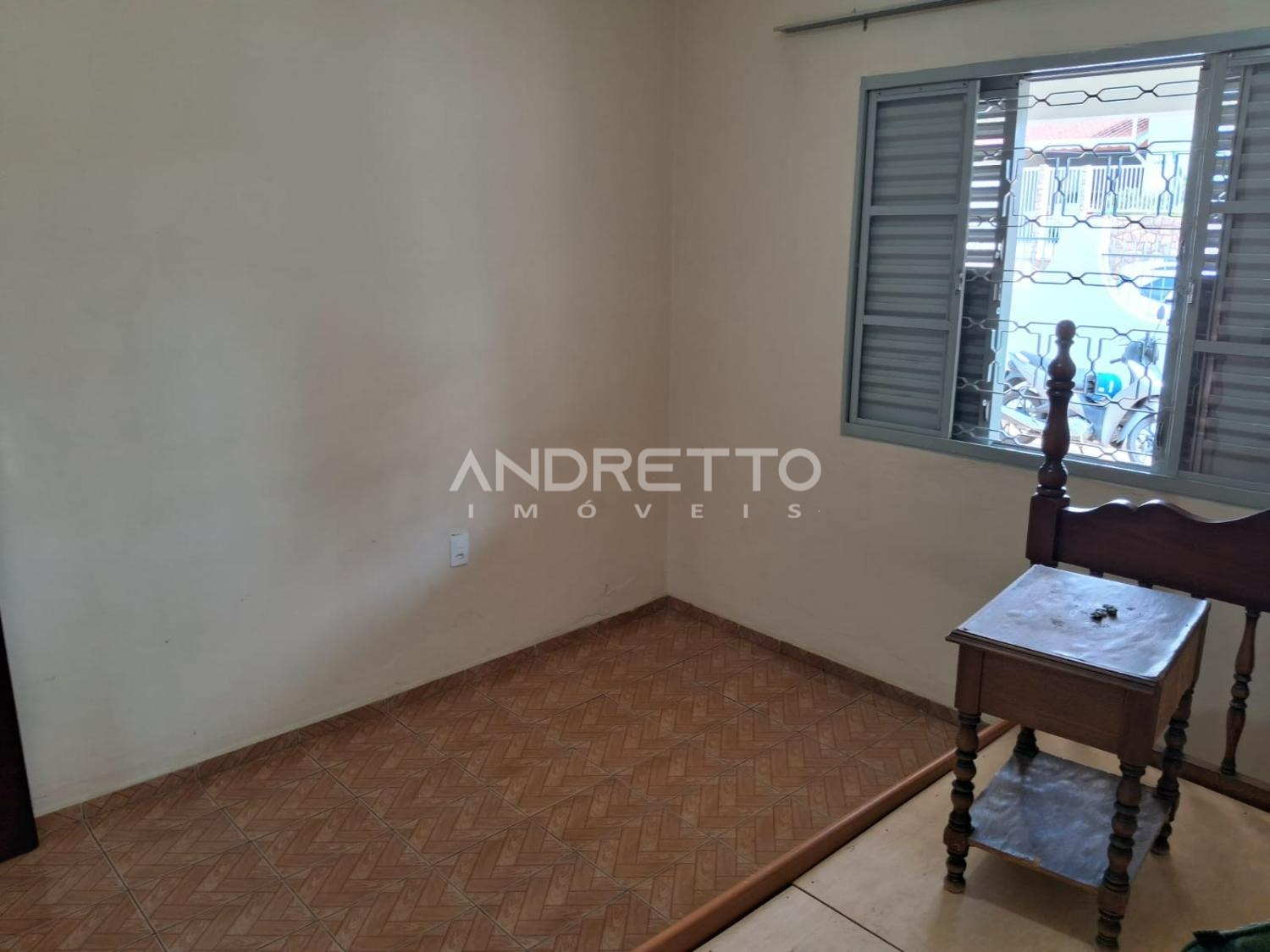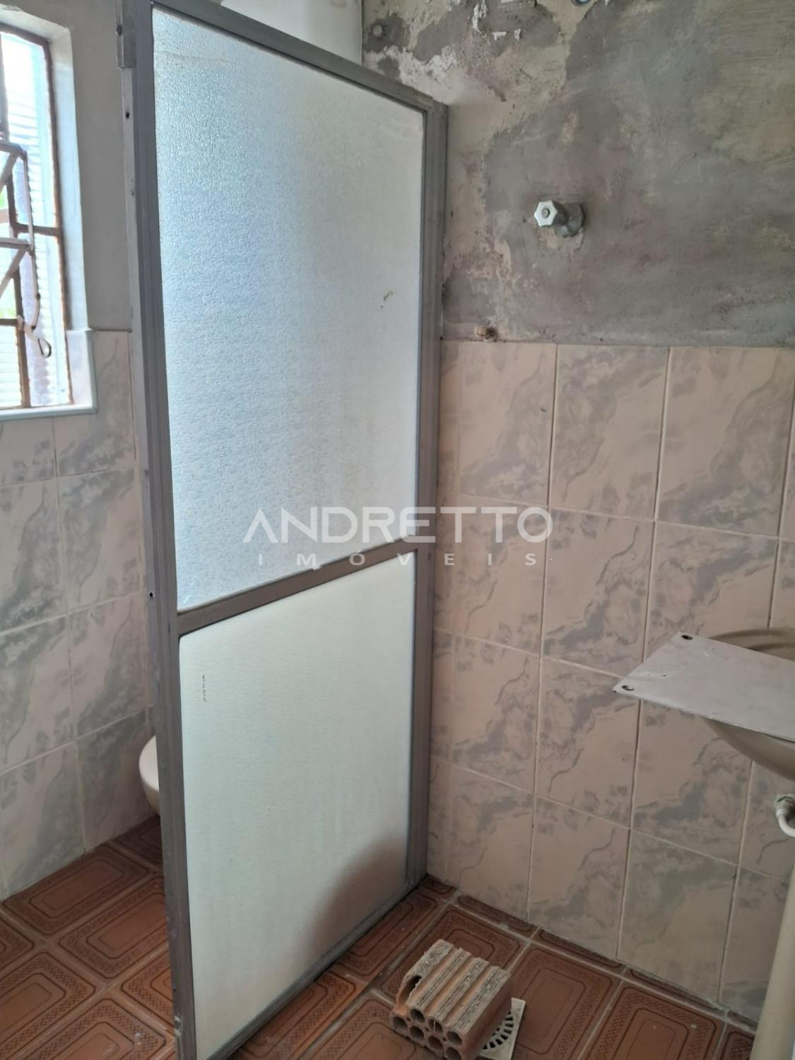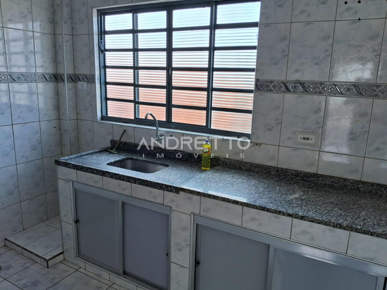 Casa com dois quartos, um banheiro social, cozinha com armários, sala de TV, área de serviço, amplo quintal com quartinho de despejo.