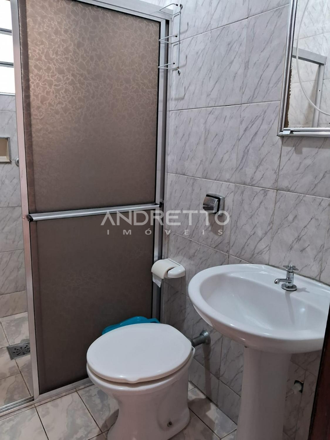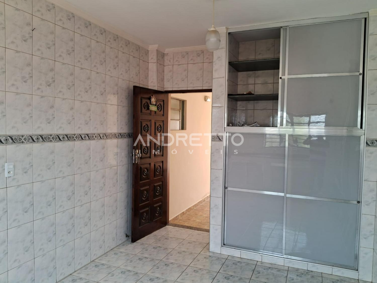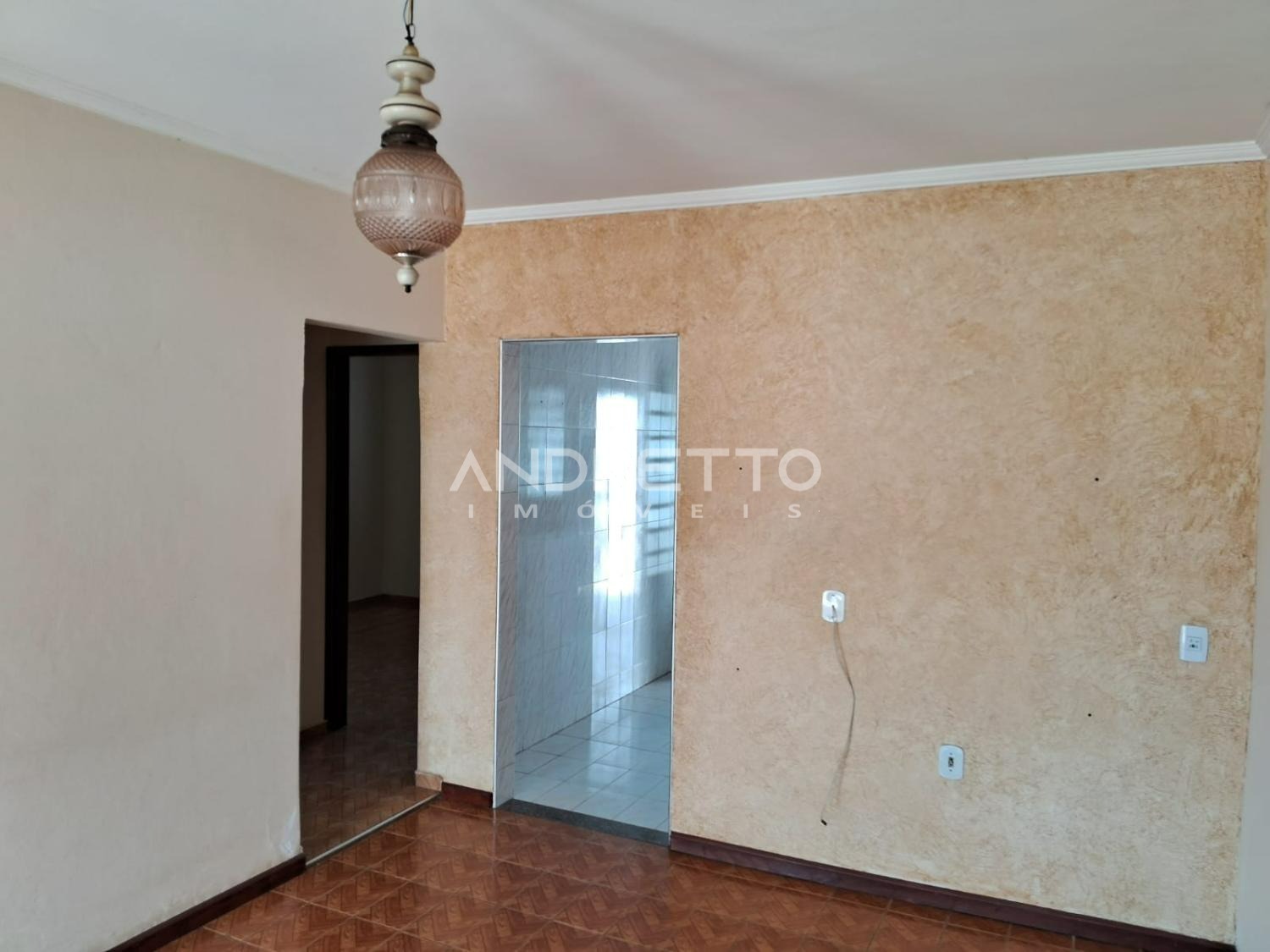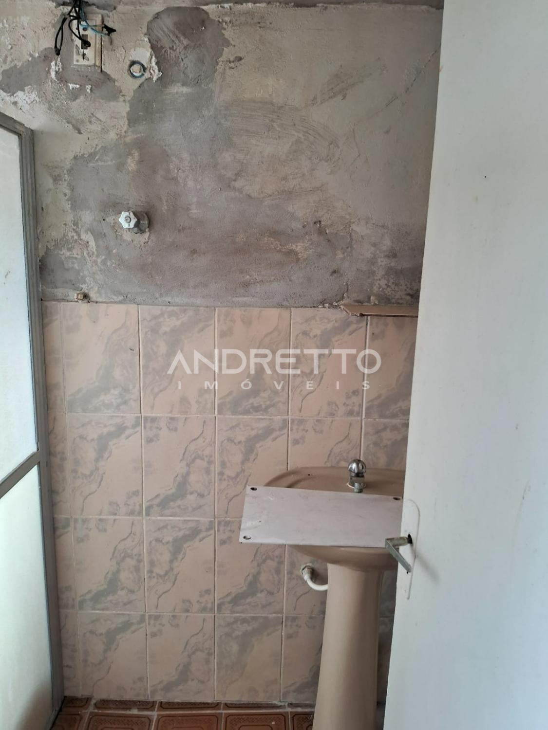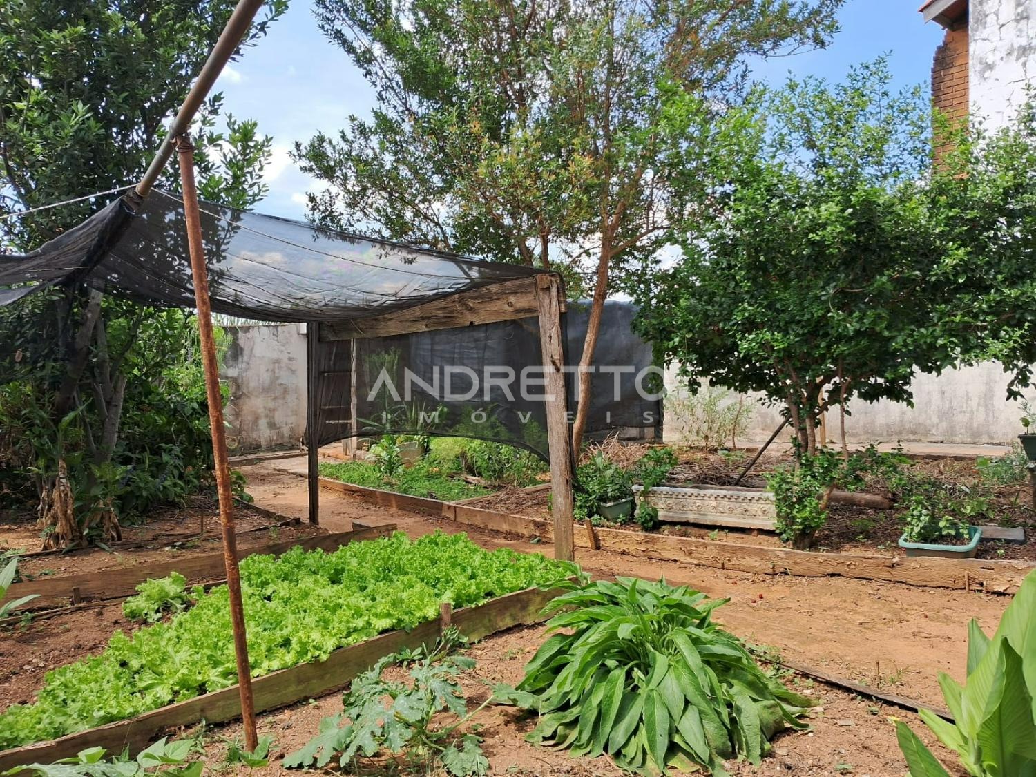 Casa com dois quartos, um banheiro social, cozinha com armários, sala de TV, área de serviço, amplo quintal com quartinho de despejo.