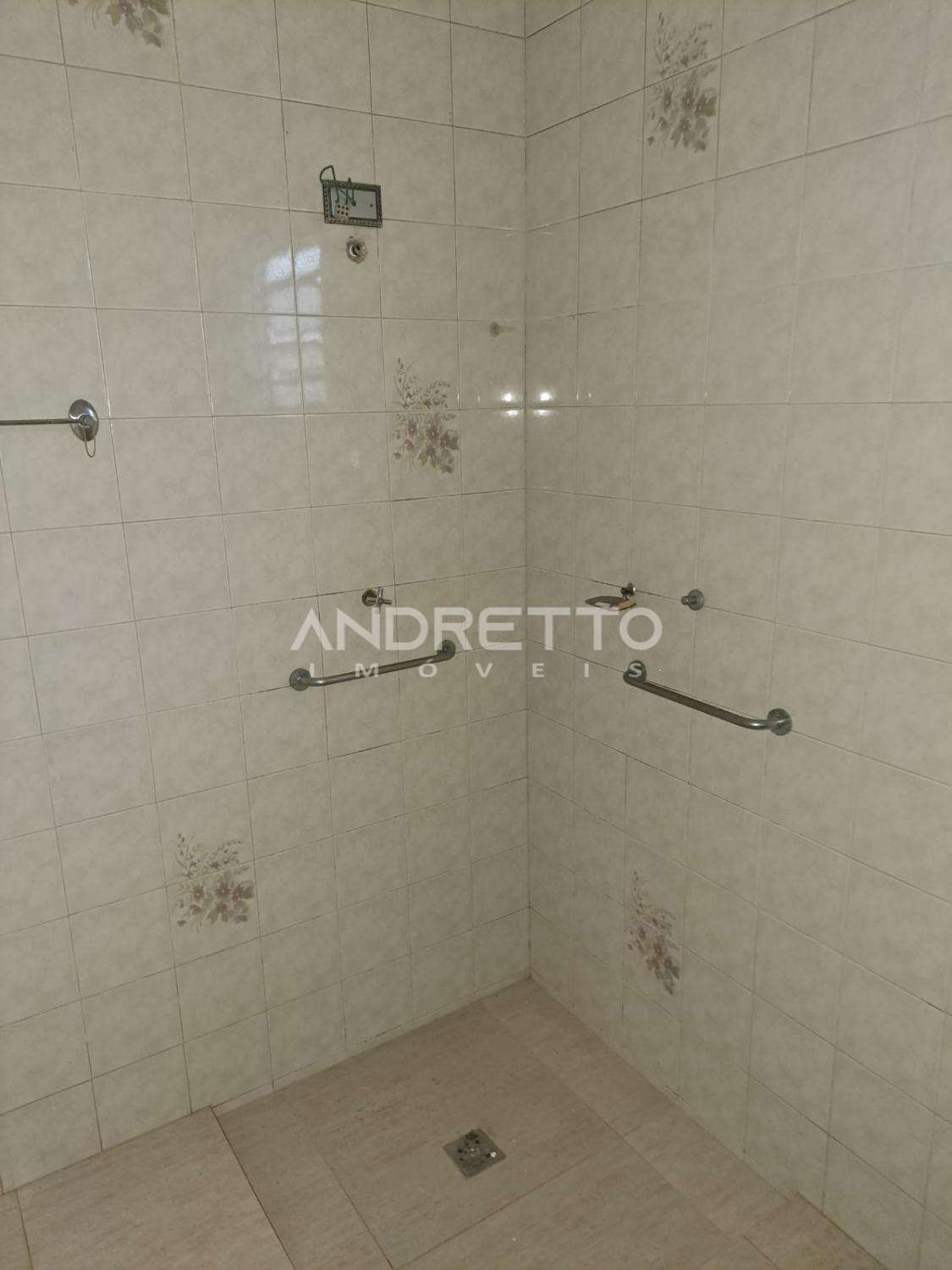 Um banheiro principal todo com barras de seguranças para evitar quedas, a casa conta com uma cozinha com gabinete na pia e armário de parede em alvenaria.