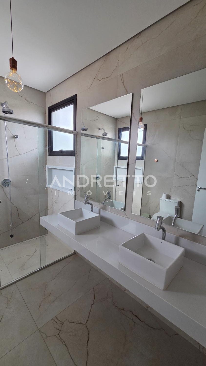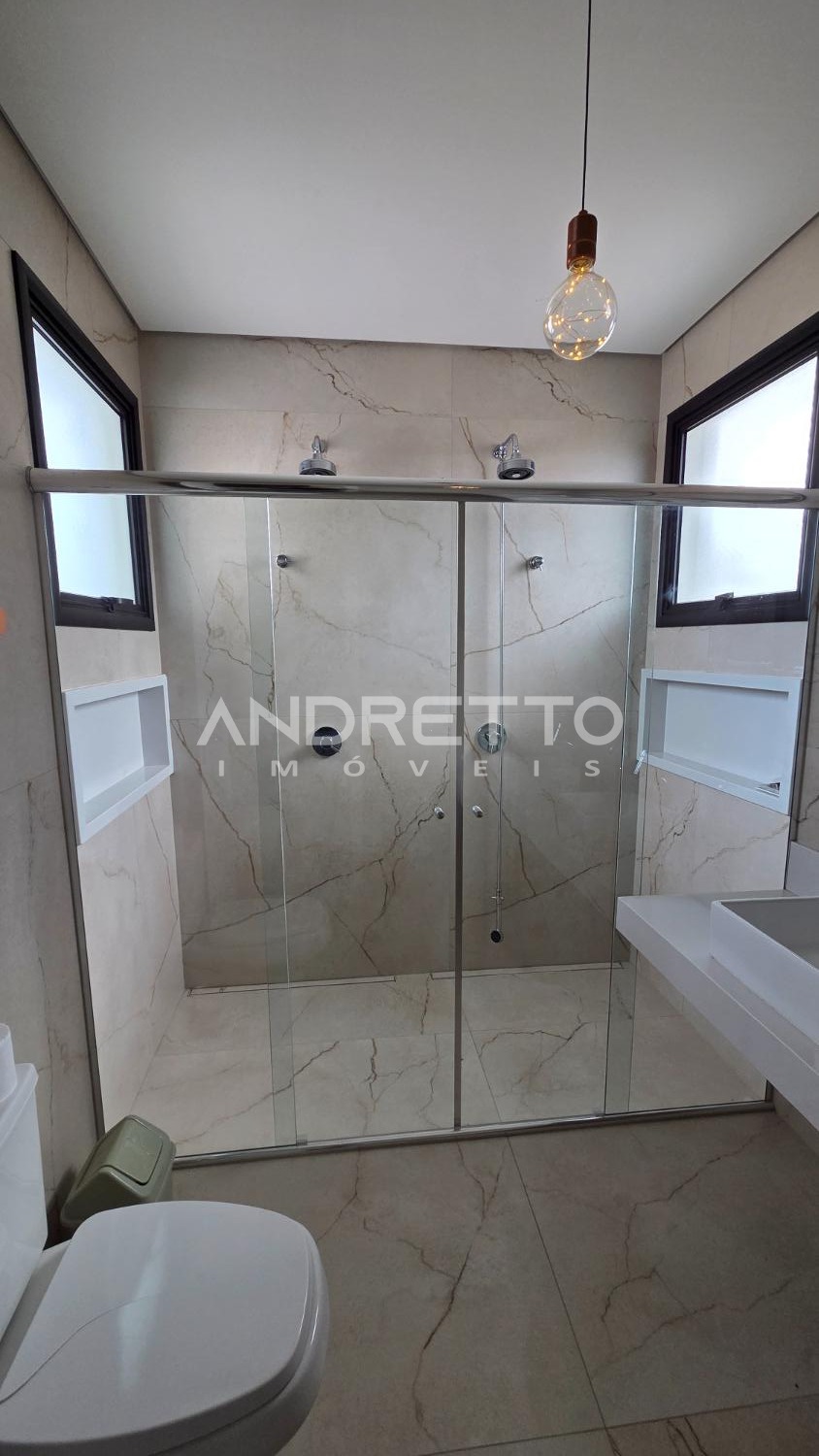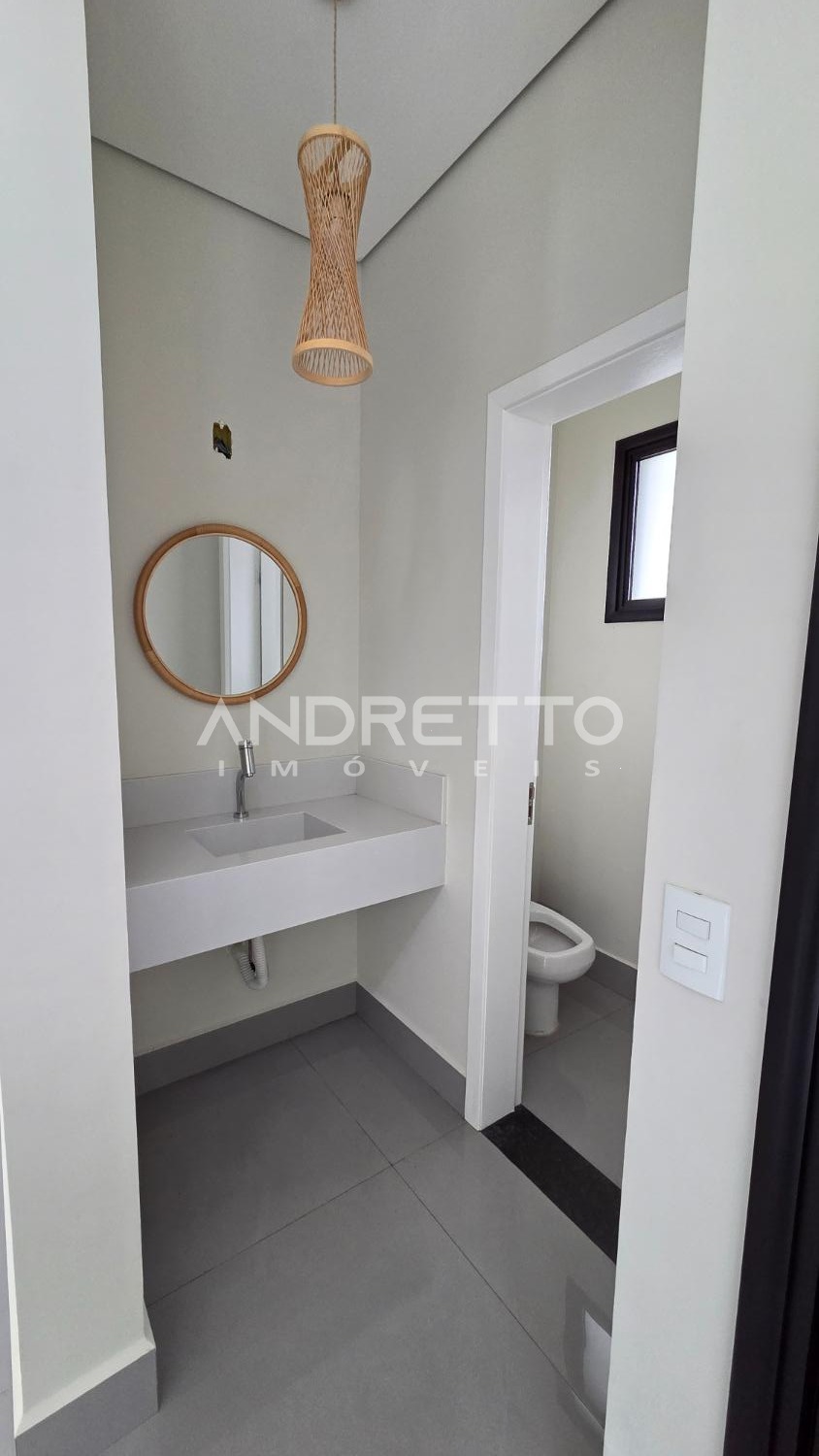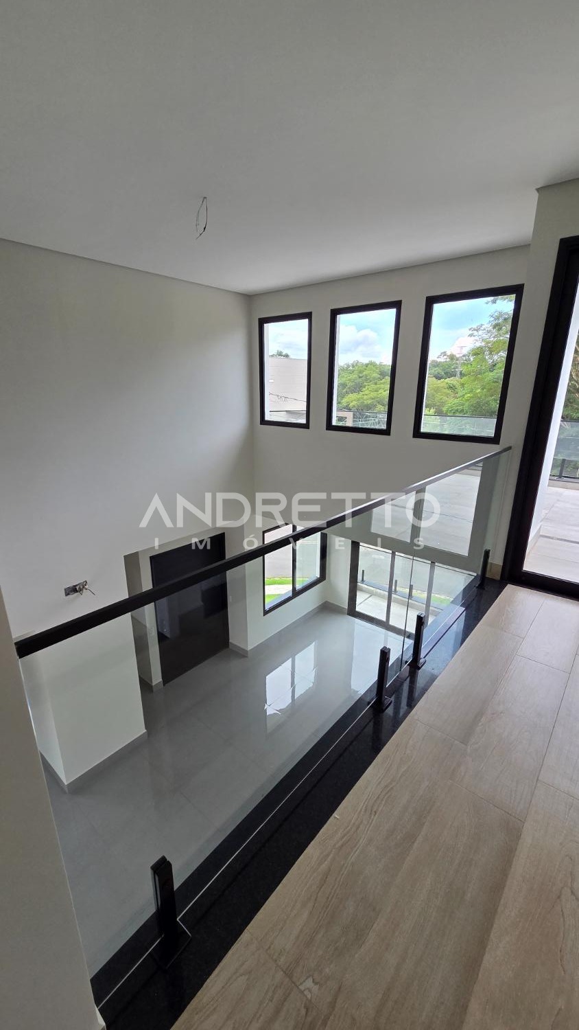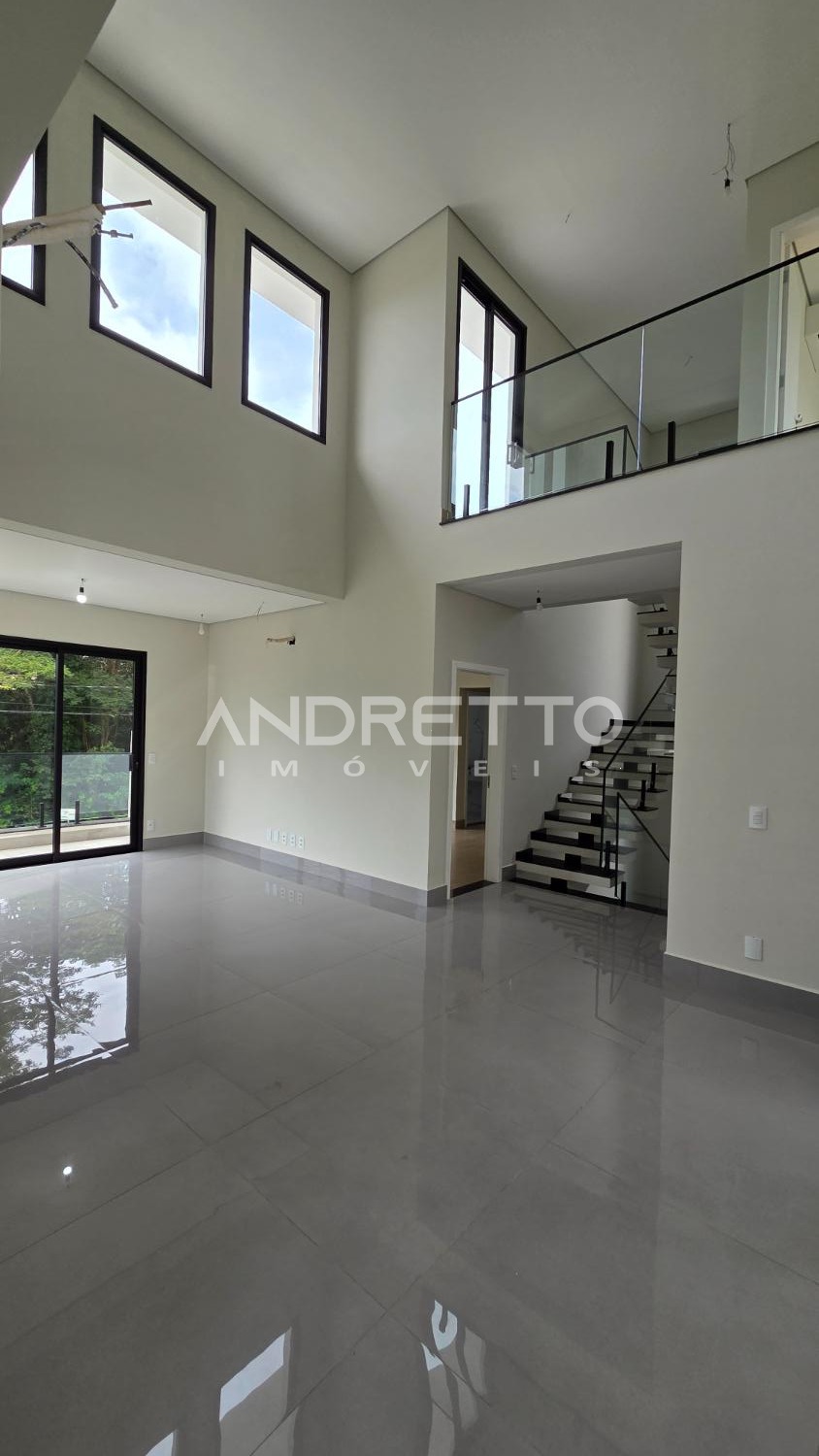 Sobrado de arquitetura moderna, com excelente distribuição dos ambientes. No térreo, conta com 02 suítes, lavabo, sala de estar e sala de jantar integradas, proporcionando amplitude e funcionalidade, além de integração total com a área gourmet, equipada com churrasqueira e acesso à piscina. A frente da casa é voltada para área verde, garantindo mais privacidade e contato com a natureza.