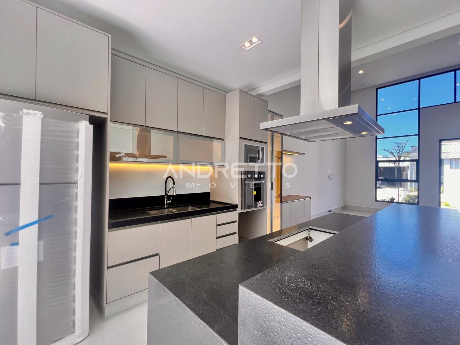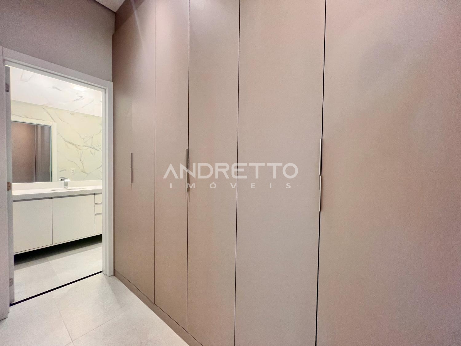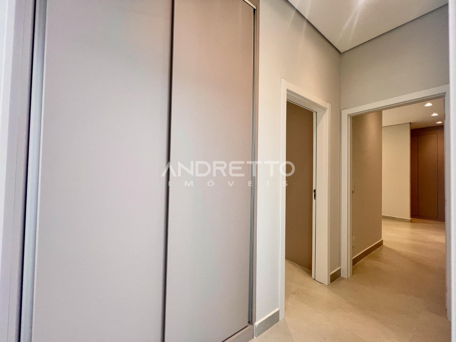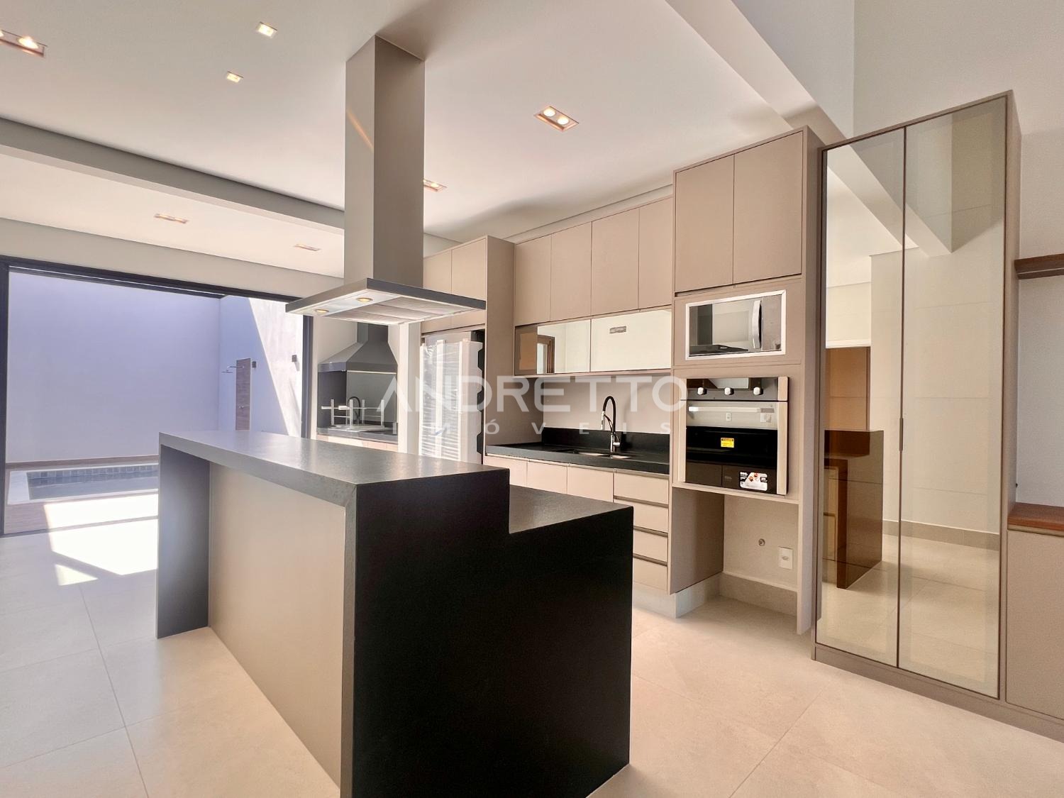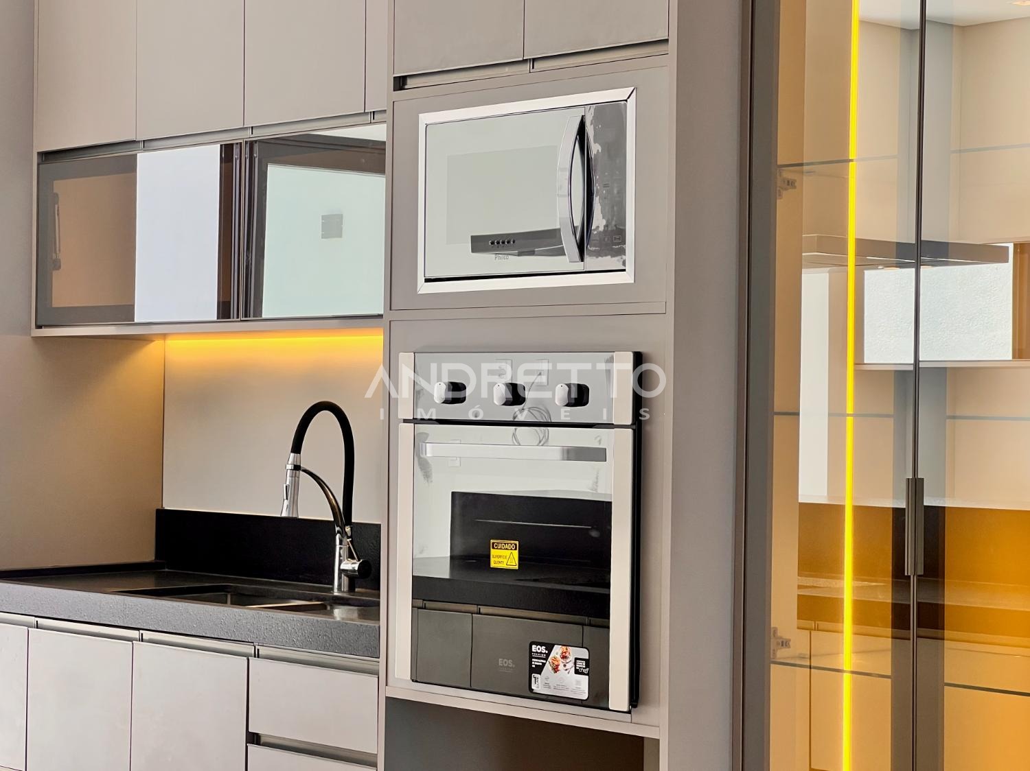 3 suítes sendo uma máster todas com armários planejados e persianas automatizadas, banheiros com armário, box e espelhos, escritório, cozinha moderna e planejada e equipada com: geladeira, forno elétrico, micro-ondas, cooktop, coifa e despensa.