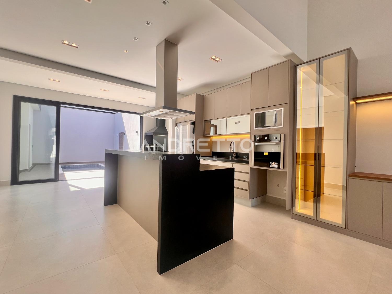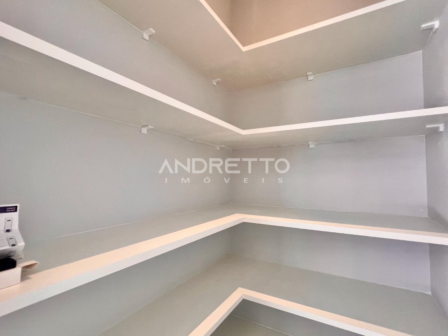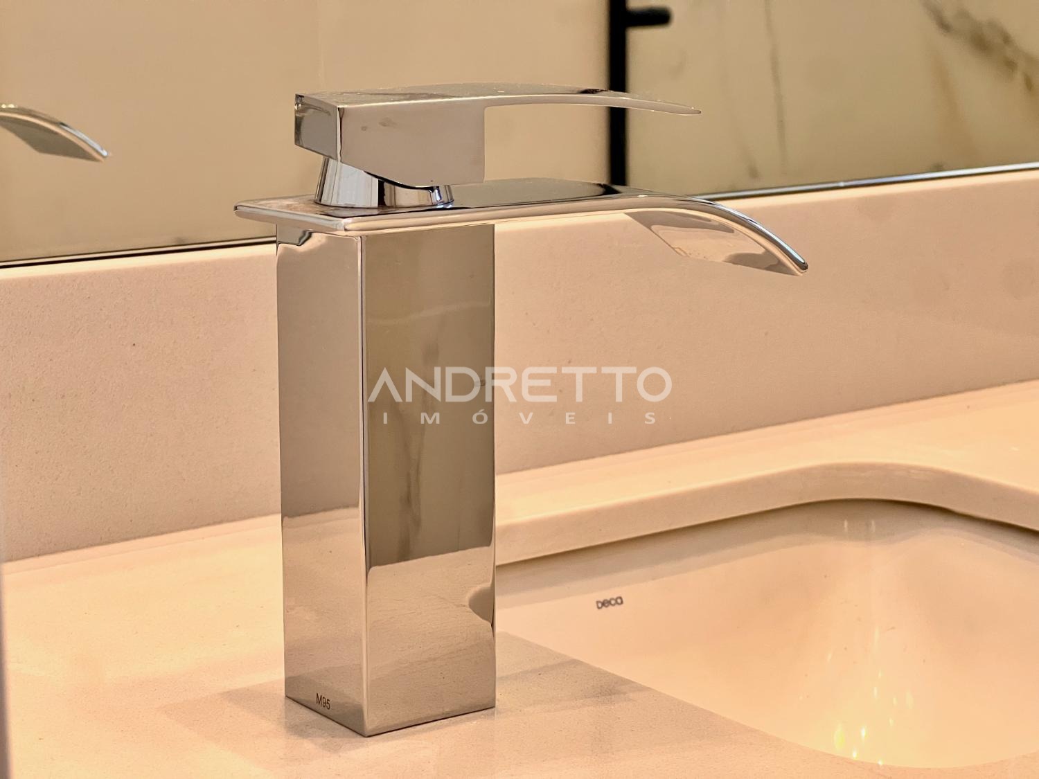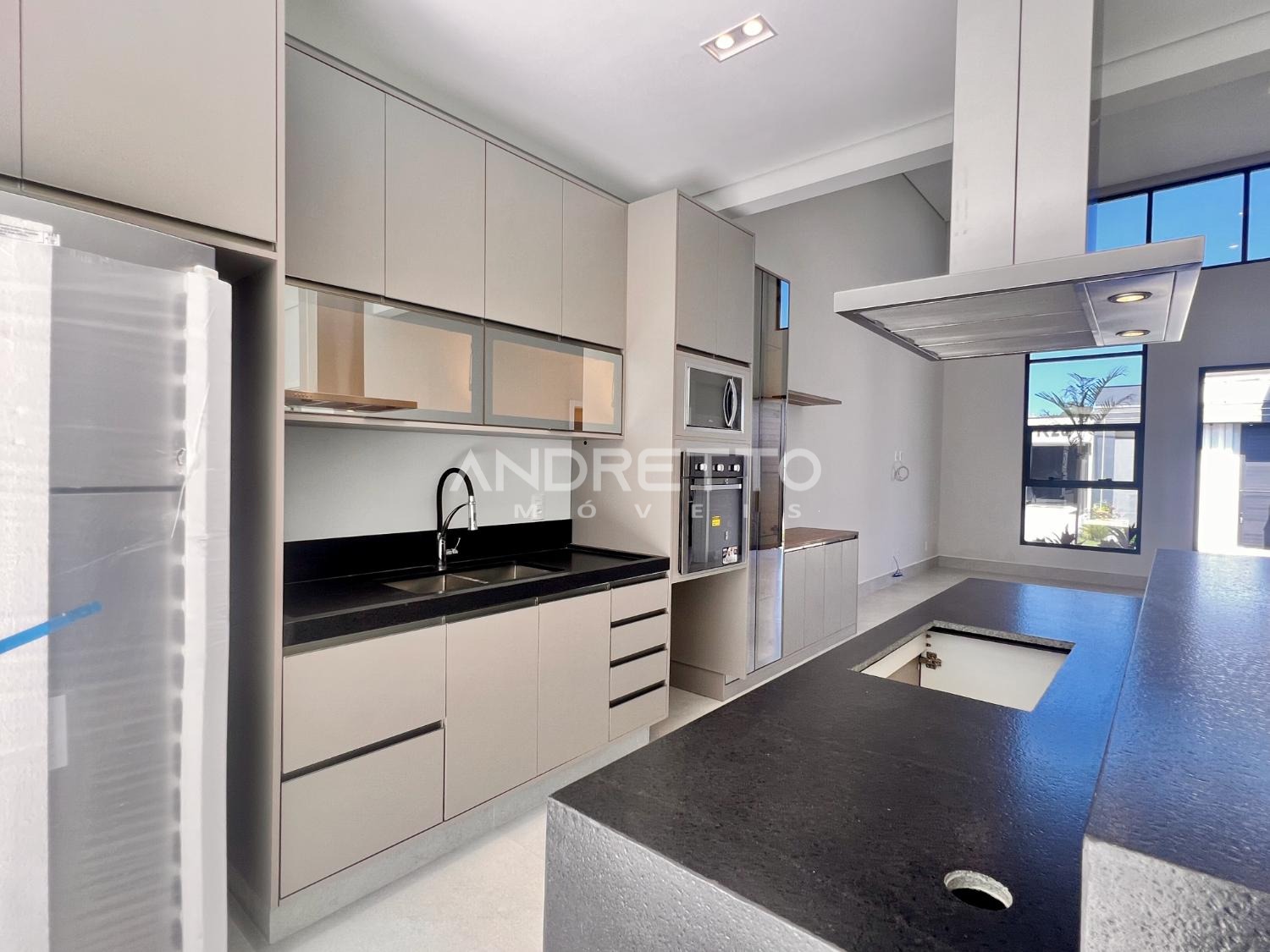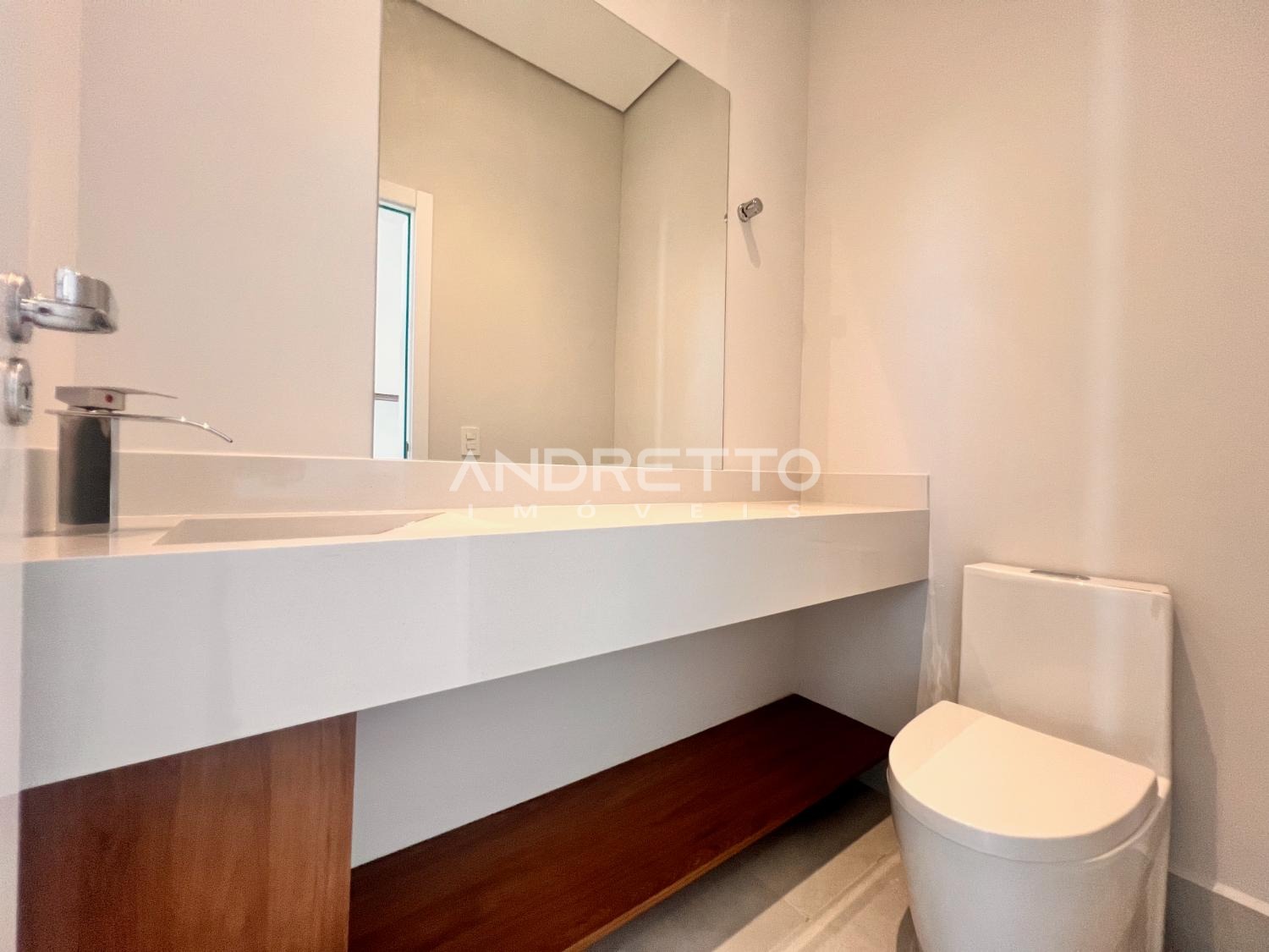 3 suítes sendo uma máster todas com armários planejados e persianas automatizadas, banheiros com armário, box e espelhos, escritório, cozinha moderna e planejada e equipada com: geladeira, forno elétrico, micro-ondas, cooktop, coifa e despensa.