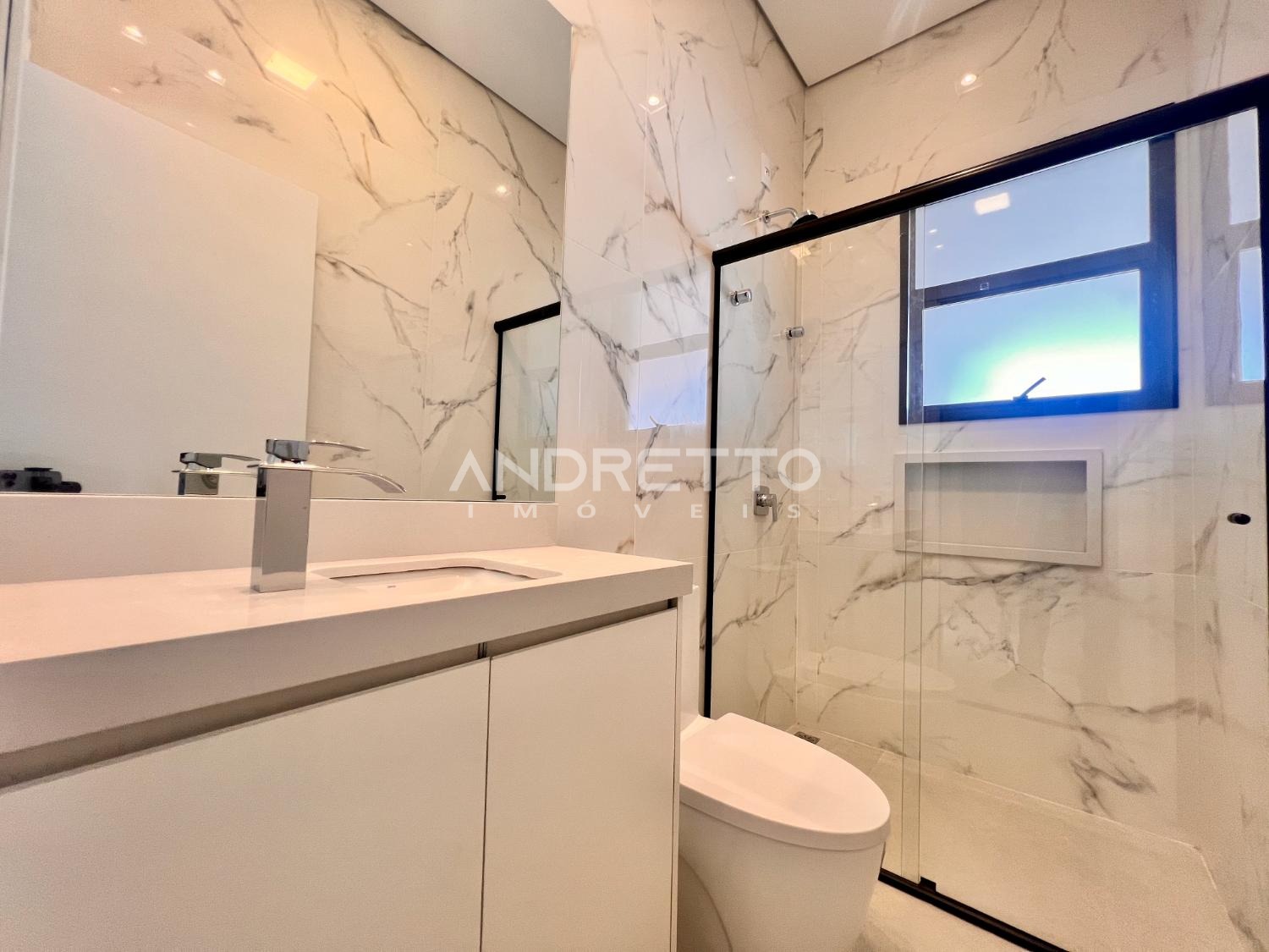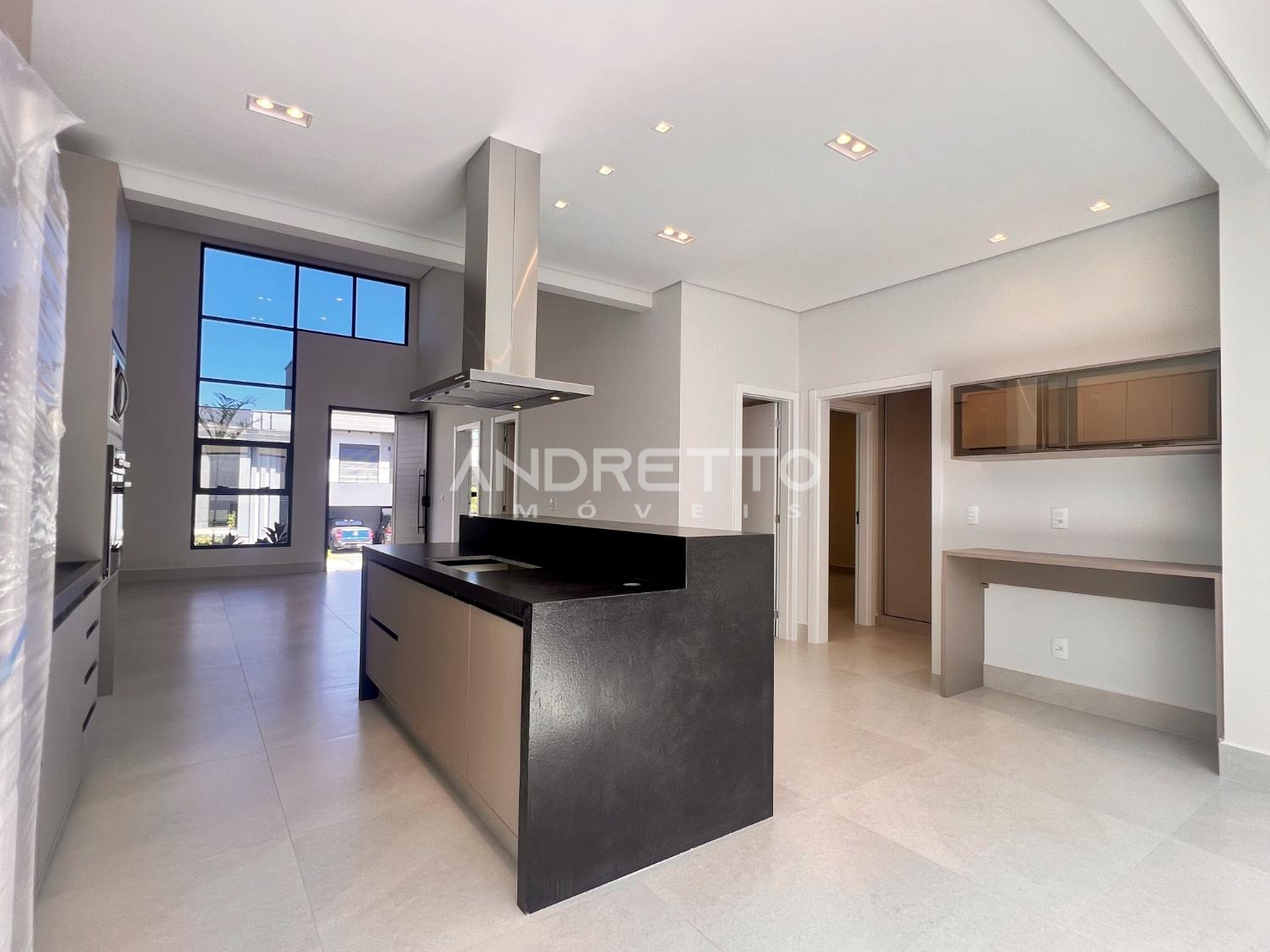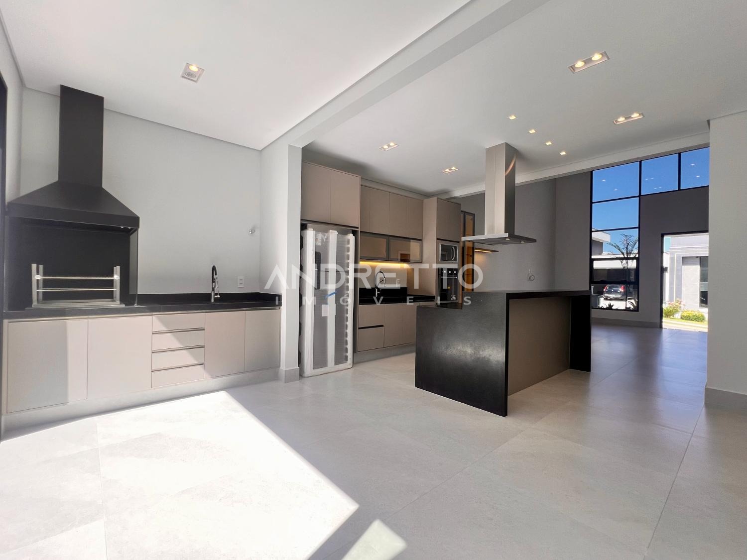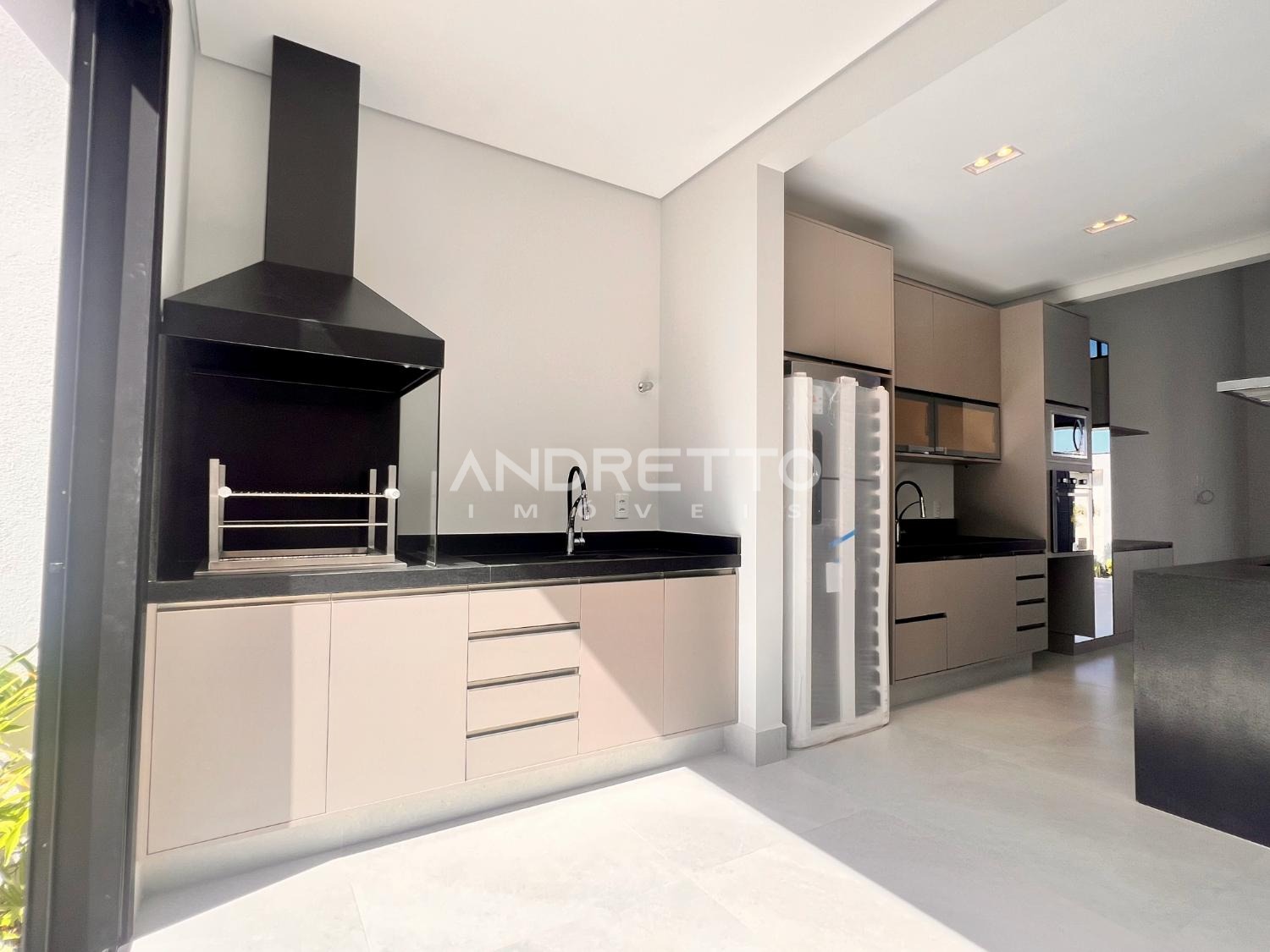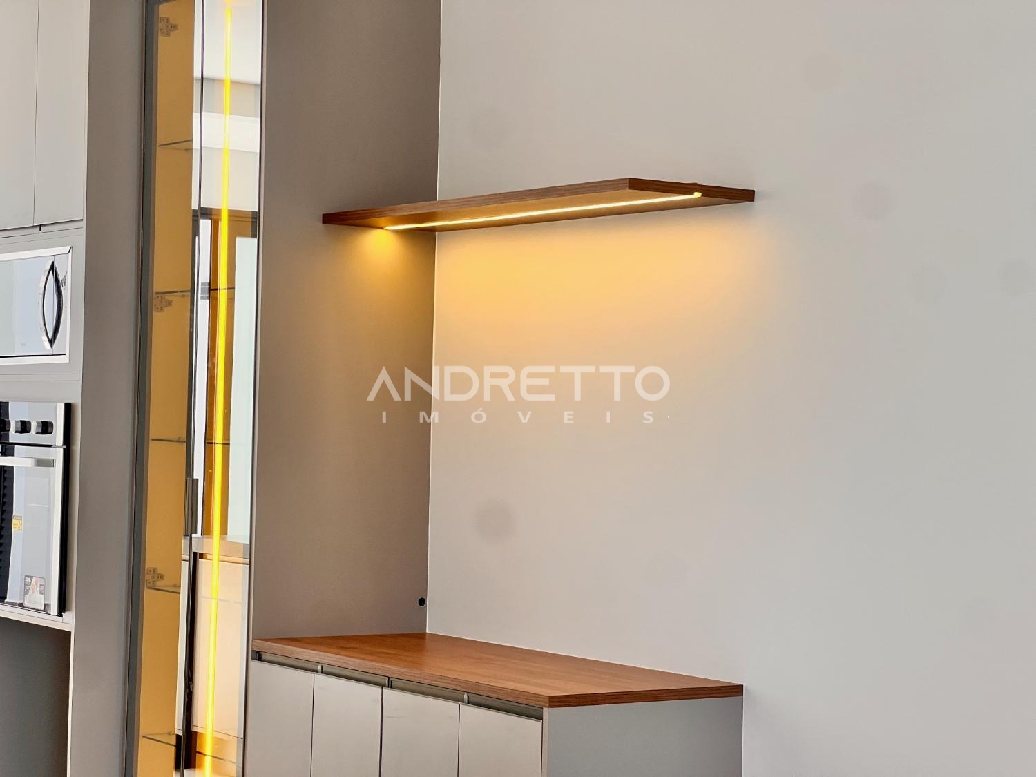 3 suítes sendo uma máster todas com armários planejados e persianas automatizadas, banheiros com armário, box e espelhos, escritório, cozinha moderna e planejada e equipada com: geladeira, forno elétrico, micro-ondas, cooktop, coifa e despensa.